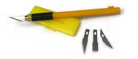 - Комплектуется тремя лезвиями: перовым лезвием (остроконечное) OL-KB4-S/5 , лезвием в форме лопатки (зубила) OL-KB-F/5 и скругленным лезвием OL-KB4-R/5. Также в комплекте имеется контейнер для хранения лезвий и колпачок для ножа.